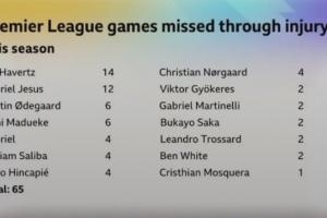 BBC統(tǒng)計(jì)阿森納本賽季截止目前的傷病,因傷導(dǎo)致的球員缺戰(zhàn)英超總場(chǎng)次數(shù)已達(dá)到65場(chǎng)。