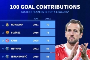 本世紀(jì)單一聯(lián)賽最快參與100球排名(五大聯(lián)賽):