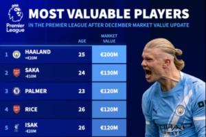 體育資訊12月09日訊 今日德轉(zhuǎn)更新新一期英超球員身價(jià),哈蘭德2億居首,伊薩克降至1.2億,維爾茨降至1.1億。