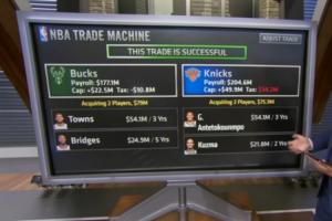據(jù)此,ESPN薪資專家Bobby Marks進行模擬交易,字母哥和庫茲馬去尼克斯,雄鹿得到唐斯和米卡爾·布里奇斯。