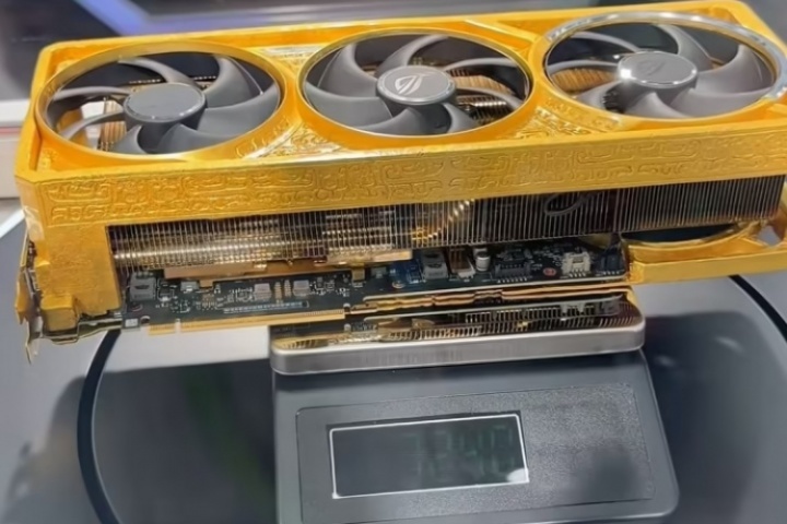 該顯卡總重達(dá) 7240g,其中 5kg 為由 24K 純金打造的主題花紋框架、護(hù)蓋、背板。目前國(guó)內(nèi)純金價(jià)格在 770 元 / 克左右,而飾品金價(jià)已突破千元每克大關(guān),按后者計(jì)算這張顯卡的物料價(jià)格即超 500 萬(wàn)元。