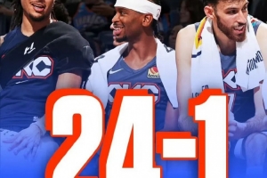 雷霆49分擊潰太陽,隊史最高16連勝,24勝1負(fù)開局——輸?shù)哪菆鍪潜晨勘常瑏啔v山大帶哈騰和三替補。