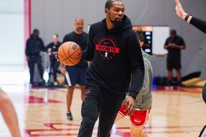 火箭官方發(fā)布了球隊(duì)訓(xùn)練照,全員狀態(tài)輕松,杜蘭特眼神專注。