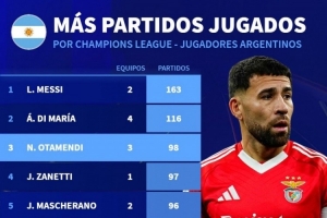 體育資訊12月12日訊 德國轉(zhuǎn)會市場統(tǒng)計了阿根廷球員的歐冠出場次數(shù),并列出榜單,梅西、迪馬利亞前兩名,奧塔門迪升至第三位。