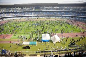 球迷對(duì)當(dāng)?shù)毓賳T發(fā)出噓聲、丟水瓶,最終大批球迷沖進(jìn)場(chǎng)內(nèi)對(duì)體育場(chǎng)進(jìn)行破壞。