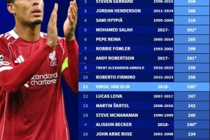 體育資訊12月14日訊 英超第16輪,利物浦在安菲爾德以2-0的比分戰(zhàn)勝布萊頓。本場比賽,紅軍隊長范戴克迎來代表球隊的第150場英超出場,這讓他足以位居隊史第11位。