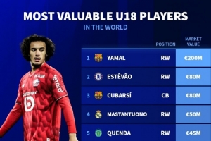 體育資訊12月14日訊 德國(guó)轉(zhuǎn)會(huì)市場(chǎng)列出了U18球員身價(jià)排名,亞馬爾2億歐居首,埃斯特旺、庫(kù)巴西次席。