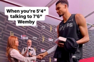 NBA女記者Rachel Nichols曬出了與文班握手照,配文:“當(dāng)1米63的你和2.32的文班(實(shí)為2米24)對(duì)話?!?/p>