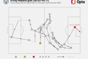 據(jù)統(tǒng)計,哈蘭德本場首粒進球經(jīng)過了球隊25次傳球,曼城上一次在英超通過更多次傳遞破門還是去年5月羅德里對陣西漢姆的進球(31次)。