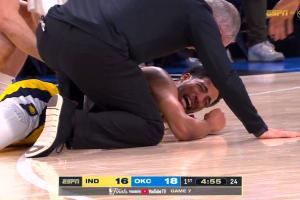 體育資訊6月23日訊 NBA總決賽G7,步行者半場48-47領(lǐng)先雷霆,哈利伯頓跟腱受傷離場。