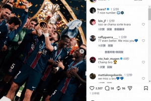 在巴黎身披7號(hào)的克瓦拉茨赫利亞社媒曬出捧杯照片,慶祝球隊(duì)奪冠,配文:“7是不錯(cuò)的數(shù)字。”