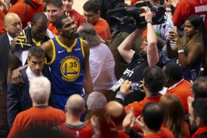 杜蘭特回憶道:“我記得當(dāng)時(shí)兩場比賽之間大概有兩天時(shí)間,所以我基本上24小時(shí)不間斷地在接受治療,我甚至要跑到多倫多城外大概45分鐘車程的地方,去做那種水下跑步機(jī)的訓(xùn)練。總之,我盡了一切努力去恢復(fù),我想回來打球,我開始感覺好一些了,然后在比賽前一天,我和隊(duì)友們打了三對三的訓(xùn)練?!?/p>