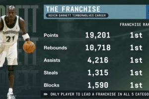 以上5項數(shù)據(jù)全部隊史第一,加內(nèi)特為NBA歷史唯一