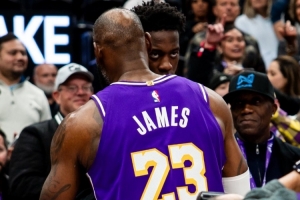 GIF-詹姆斯昨天賽后第一時(shí)間和場邊觀戰(zhàn)的25年?duì)钤鬅酇J·迪班薩擁抱耳語
