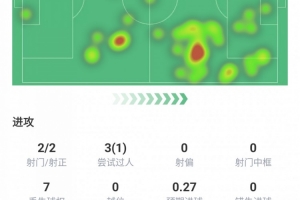 出場63分鐘,進(jìn)1球,射門2次,射正2次,嘗試過人3次成功1次,丟失球權(quán)7次,預(yù)期進(jìn)球0.27