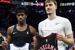 賽后,獨(dú)行俠狀元弗拉格和76人探花秀VJ·埃奇庫姆交換了球衣。
