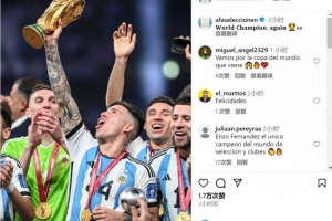 阿根廷隊(duì)官方社媒曬出恩佐2022年世界杯奪冠后舉起大力神杯的照片,配文:“再次贏得世界冠軍?!?/p>