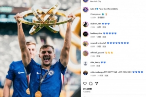 他也在賽后通過社媒曬出自己的捧杯照,并配文:“將世界染成藍色!冠軍!?? ??”