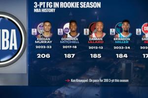 克尼佩爾今天生涯第29場(chǎng)比賽已命中100記三分,新秀歷史最快!