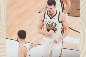 賽后勇士官方曬出贏球海報,封面為庫里+波斯特慶祝的一幕。