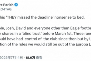 帕里什社媒駁斥“水晶宮錯過改變股權最后期限”的說法,他寫道:“讓我們來終結‘他們錯過了最后期限‘的無稽之談?!?/p>