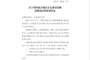 足協(xié)官方消息,河南萬仙山女足球員蒂婭被停賽4場,罰款8000元。