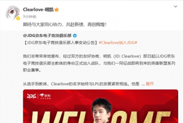 體育資訊07月14日訊 前EDG名宿廠長(zhǎng)Clearlove官宣加盟JDG,并擔(dān)任第三賽段主教練。