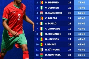 體育資訊12月27日訊 德轉(zhuǎn)列出了本屆非洲杯球員身價(jià)排行榜,阿什拉夫位列第一。