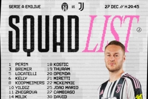 體育資訊12月27日訊 北京時(shí)間明天凌晨,尤文將在意甲第17輪比賽中客場對陣比薩,尤文公布了此役的球員名單??兹?、卡巴爾、魯加尼、弗拉霍維奇缺席。