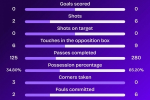 上半場曼城射門6次,射正0次,據(jù)Squawka統(tǒng)計,曼城2025年首次英超上半場比賽0射正。