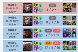 體育資訊12月28日訊 根據(jù)排位統(tǒng)計小程序顯示,BLG上單Bin近日在韓服狂玩狼母和亞恒。