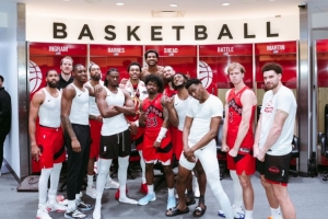 賽后,猛龍全隊(duì)在更衣室拍攝全家福慶祝勝利,斯科蒂·巴恩斯獲戴本場最佳球員的大金鏈子。