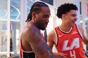 賽后,萊昂納德在更衣室被澆水慶祝,他打趣道:“我會(huì)給你們所有人寄送賬單。你們得讓我去編一次頭發(fā)???!?/p>