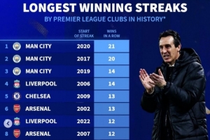 英超球隊(duì)歷史各項(xiàng)賽事最長(zhǎng)連勝榜: