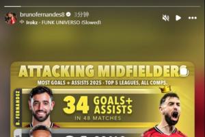 體育資訊12月29日訊 B費更新社媒,曬出自己在2025年五大聯(lián)賽進攻型中場進球+助攻數(shù)據的排名,他本人以35次進球+助攻位列榜首!