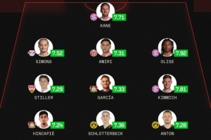 前衛(wèi):哈維·西蒙斯(萊比錫,7.52分)、阿米里(美因茨,7.31分)、奧利塞(拜仁,7.92分)