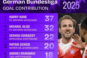 體育資訊12月30日訊 2025年即將結(jié)束,squawka也統(tǒng)計(jì)了本年度德甲直接參與進(jìn)球榜,凱恩和奧利塞均參與了至少30球。