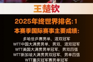 王楚欽在WTT中國(guó)大滿貫收獲三冠王,在美國(guó)大滿貫收獲男單冠軍,在重慶冠軍賽收獲男單冠軍。此外,他還獲得了亞洲杯的男單冠軍。