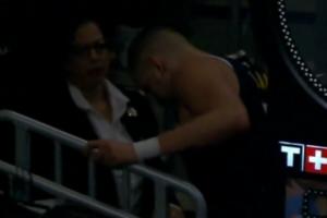 GIF-約老師疼得后滾翻 一瘸一拐扶著護欄走回更衣室