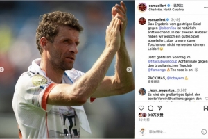 體育資訊6月25日訊 世俱杯小組賽,C組第3輪,拜仁0比1不敵本菲卡。賽后,穆勒更新社媒鼓勵(lì)球隊(duì)在淘汰賽中繼續(xù)前進(jìn)。