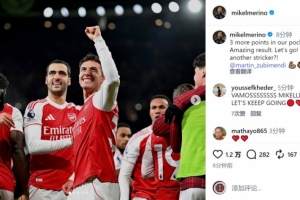阿森納中場(chǎng)梅里諾社媒曬出與進(jìn)球功臣蘇維門迪一起慶祝的照片,配文:“我們又收獲3分!很棒的結(jié)果,繼續(xù)加油!”