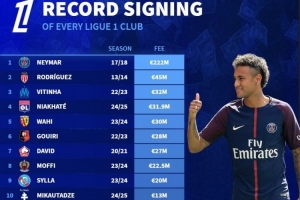 體育資訊7月15日訊 德國轉(zhuǎn)會市場統(tǒng)計了法甲各俱樂部的最貴引援,并列出榜單,巴黎2.22億歐簽下內(nèi)馬爾居首。