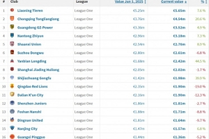 體育資訊6月25日訊 日前,德國轉(zhuǎn)會市場網(wǎng)站統(tǒng)計了更新后的中甲球隊身價排行。
