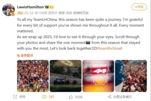 漢密爾頓微博寫道:致我所有的中國車迷,這個賽季是一段不平凡的旅程。感謝你們一直以來對我的支持,每一刻都意義非凡。隨著2025年的結(jié)束,我想通過你們的視角來回顧這一年。翻閱你們的照片,分享本賽季最讓你難忘的一刻??。讓我們一起回味這段時光。