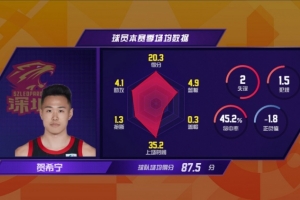 常規(guī)賽第二周周最佳球員賀希寧本場比賽發(fā)揮出色,他18次出手命中11球,得到賽季新高的29分。末節(jié)決勝時(shí)刻,賀希寧接管了比賽,他包辦了球隊(duì)最后12分中的10分。身體強(qiáng)壯的深圳后衛(wèi)先是突破造成付豪犯規(guī)打成2+1,隨后又在轉(zhuǎn)換進(jìn)攻中上籃得手。最后1分20秒,賀希寧再次突破打成2+1,當(dāng)他站上罰球線時(shí),主場球迷高喊起了“MVP”。