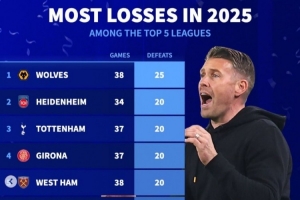 體育資訊1月1日訊 2025年已經(jīng)結(jié)束,《轉(zhuǎn)會市場》也統(tǒng)計(jì)了本年度五大聯(lián)賽輸球場次最多情況,前五有3支英超球隊(duì)。