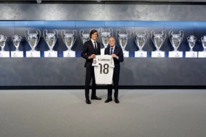 簽約后,A費收到了一個伯納烏球場模型復(fù)制品、一塊手表以及一件印有其名字的18號球衣。