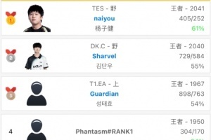 體育資訊1月2日訊 根據(jù)排位統(tǒng)計(jì)小程序顯示,韓服前十排行榜更新,TES打野選手naiyou登頂。