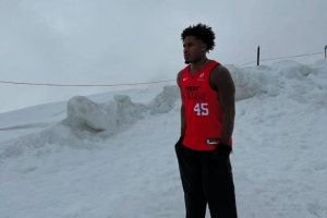 米切爾身穿印有自己外號(hào)“Off-Night”的球衣,站在冰天雪地中,略顯寒冷。