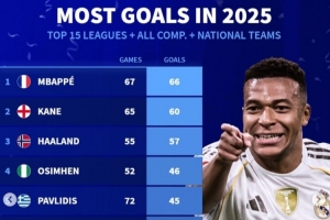 體育資訊1月2日訊 2025年已經(jīng)過去,《轉(zhuǎn)會(huì)市場》也統(tǒng)計(jì)了2025前15聯(lián)賽球員的俱樂部+國家隊(duì)各項(xiàng)賽事總進(jìn)球情況,皇馬前鋒姆巴佩領(lǐng)跑。